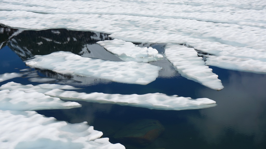 Auch bei einer anderen Tour kamen wir aufgrund von Schnee nicht so weit wie wir uns das gewünscht hatten, aber dafür gab es diesmal Sonne satt und einen unglaublich klaren Bergsee. Um ihn herum Bäume, die unter der Last des Schnees aufgebrochen waren und Blicke auf die umliegenden Gipfel die zum Jostedalsbreen Nationalpark gehören. Einem Schild zufolge soll es um den See auch Rentiere geben, von denen wir aber nur Spuren gesehen haben.