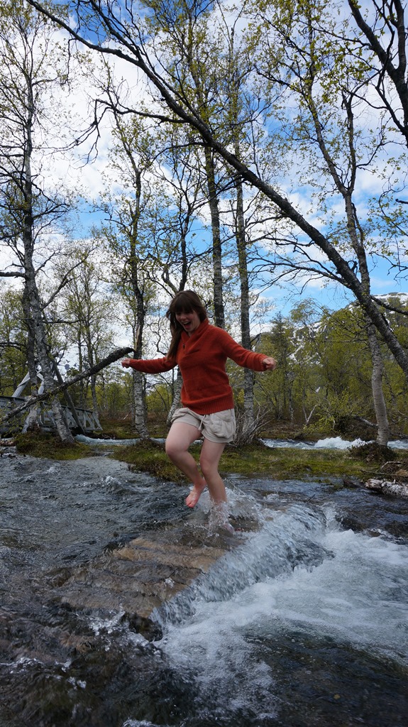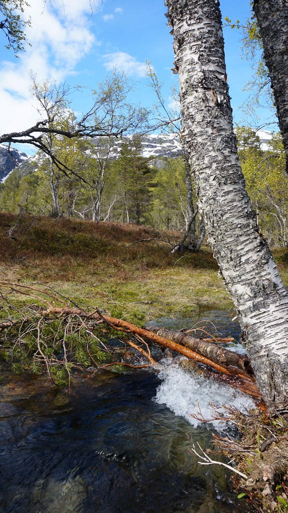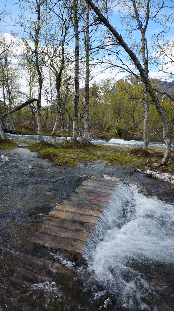 Nachdem unser erstes Teilstück auf dem Fossestien ja nur mit Schneeschuhen möglich gewesen wäre war uns klar, dass es auch einige Wasserfallhöhenmeter tiefer noch nass werden könnte. Und so standen wir dann auch kurz vor dem Ziel plötzlich vor einem reißenden Bach und einer überfluteten Ebene. Da uns das Wasser sonst mitgerissen hätte entschieden wir uns aus der Umgebung ein paar Äste und Baumstämme zusammenzutragen, um zumindest den tiefsten Bach zu überbrücken.