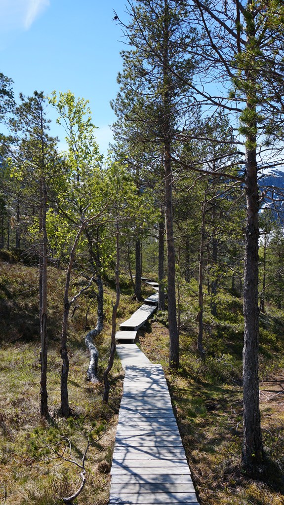 Auf Brücken, Steinen, Bohlenwegen, Bäumen, Holzschildern… überall sah man das rote „F“, welches für Fossestien steht. Dieser uralte von Mensch und Tier ausgetretene Pfad wiederum verpricht einen rauschenden Wasserfall nach dem anderen, nasse Füße, Bohlen und Knüppelwege, klarste Seen und wie könnte es in Norwegen anders sein immer wieder Ausblicke in die Weite.