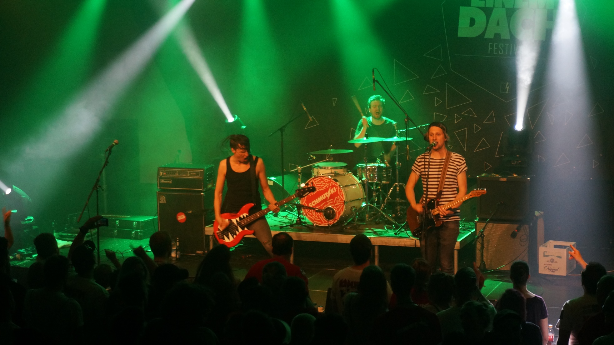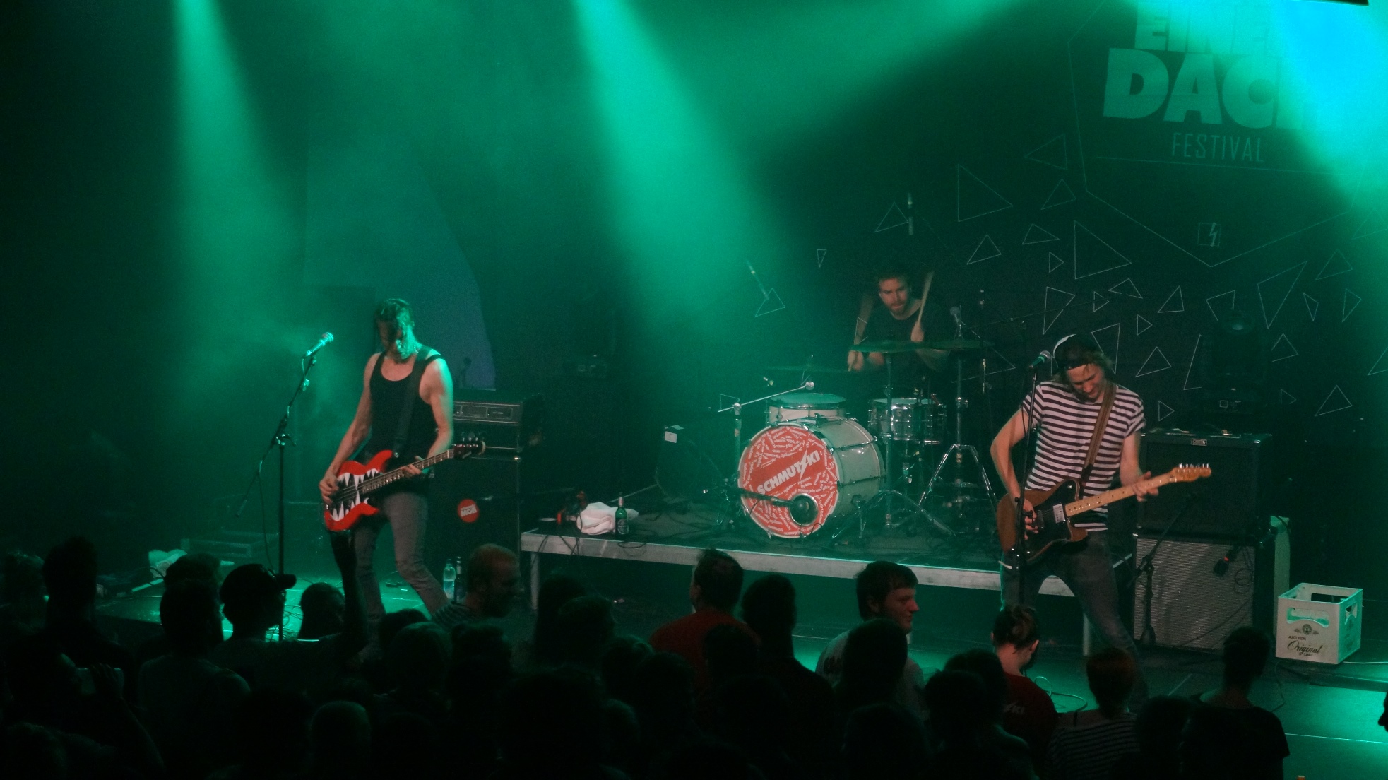 Die tanzbaren Songs von Giant Rooks waren dann auch ein bisschen daran Schuld, dass ich ein eigentlich ganz fest eingeplantes Konzert zum Großteil verpasste. Denn Ramona vom Augsburger Musikblog Princess Pietsch hatte kürzlich mit höchstem Lob über die Leoniden geschrieben. Ich habe zwar nur die drei letzten Songs gesehen, aber ich kann restlos bestätigen, dass die Leoniden auf der Bühne und damit auch davor eine wahnsinnige Energie entfesseln. Eindeutiges und objektives Qualitätsmerkmal: Das Publikum war am Ende genauso nassgeschwitzt, wie die tropfende Band. Die muss ich wirklich unbedingt noch einmal sehen!