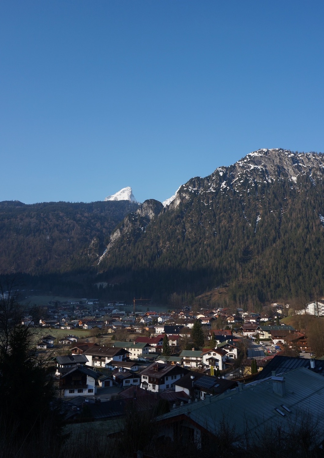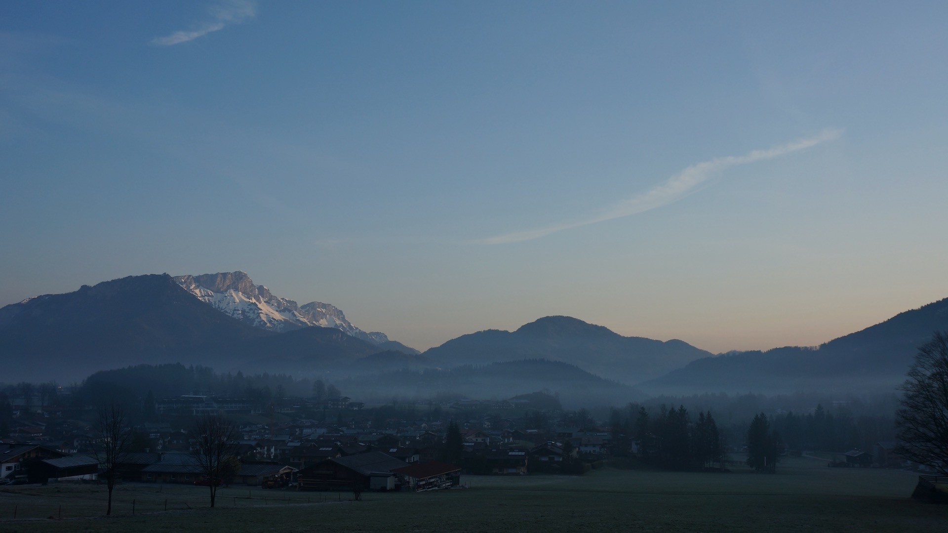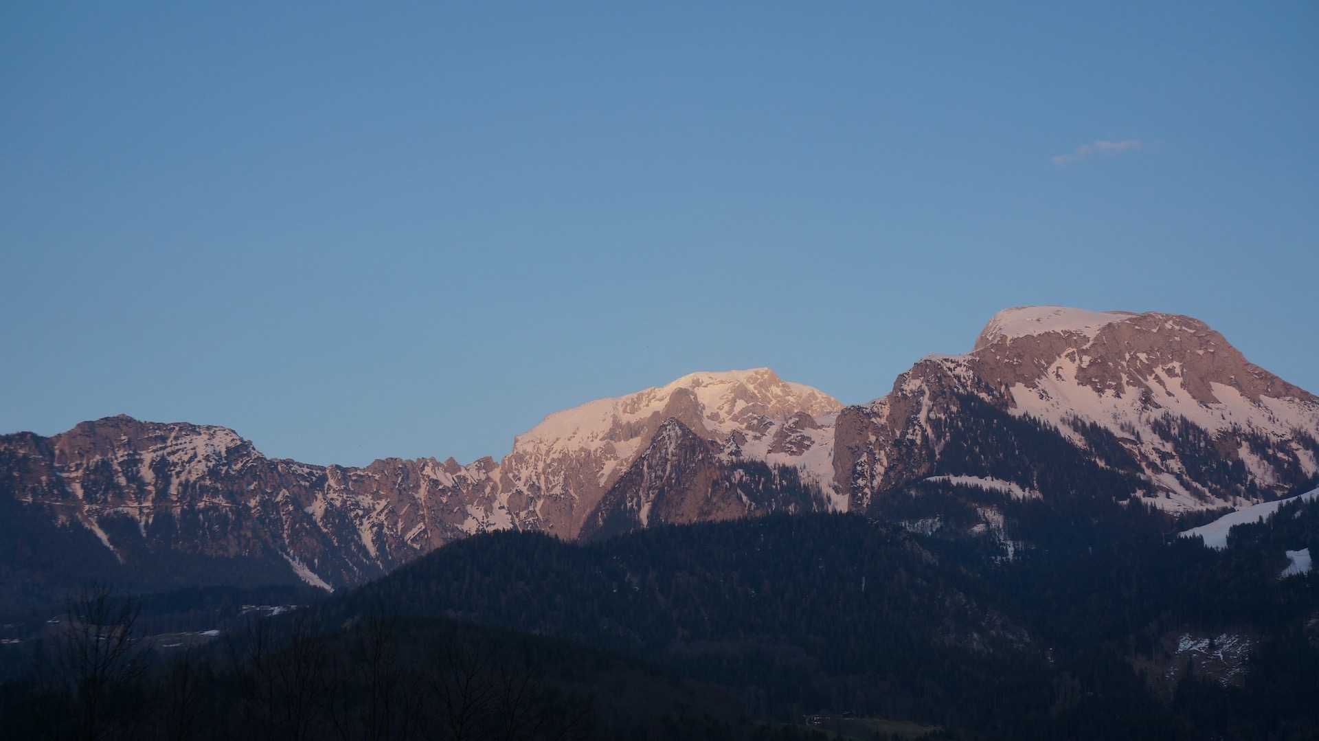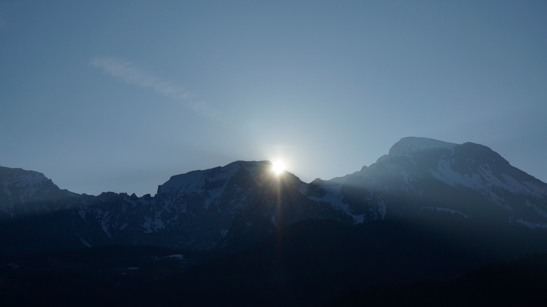 Da standen wir also. Winterjacke, Schal, Mütze, das Kind warm am Bauch tragend. Der Boden unter uns gefroren. Die Sonne erreichte nach und nach erste Bergspitzen und lugte dann über den hohen Göll.