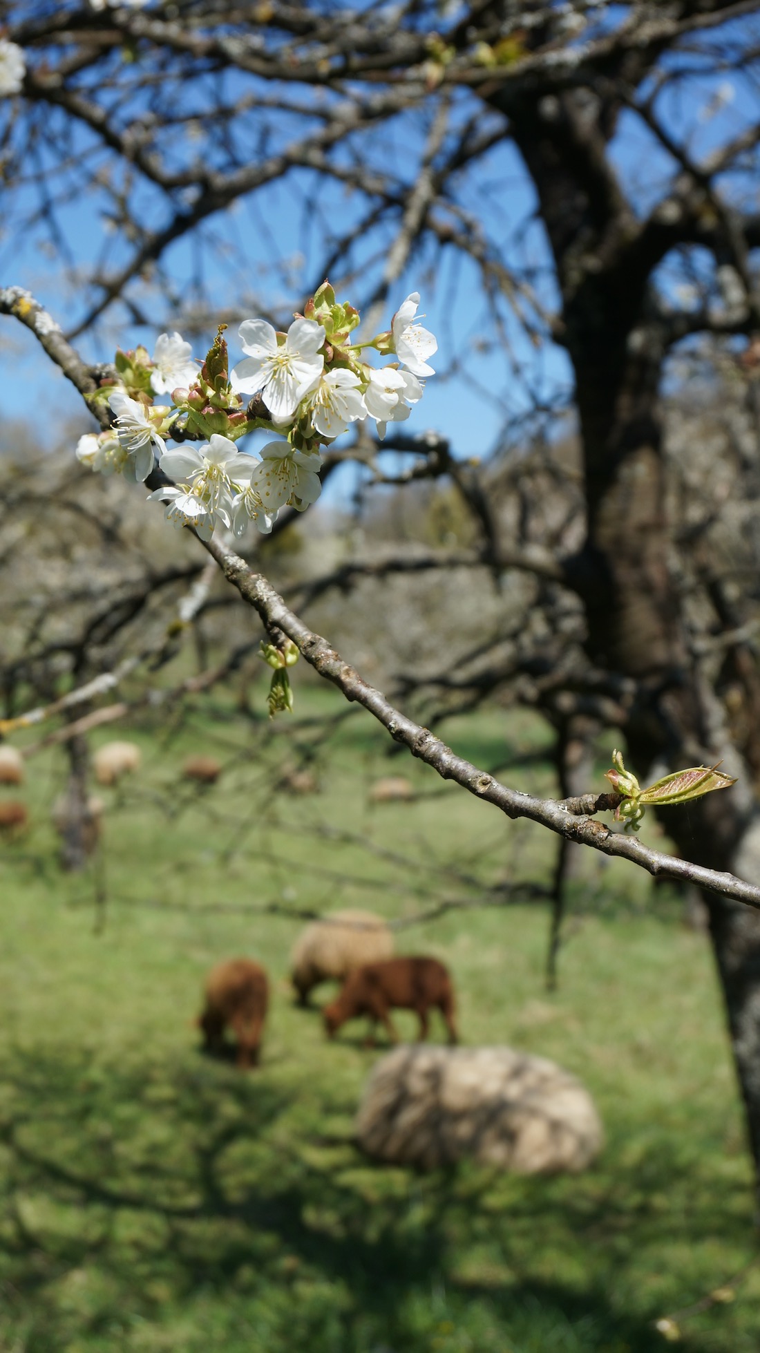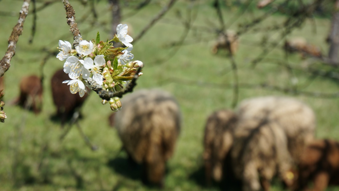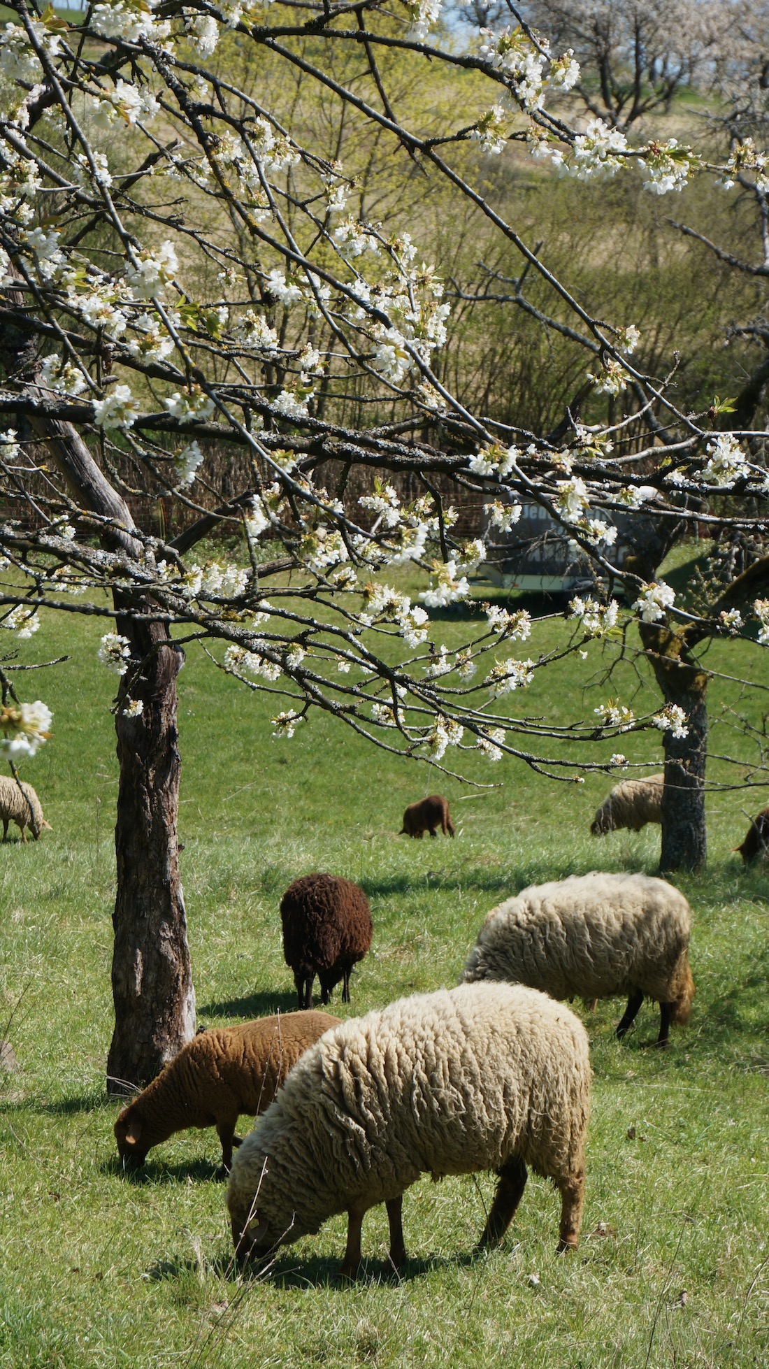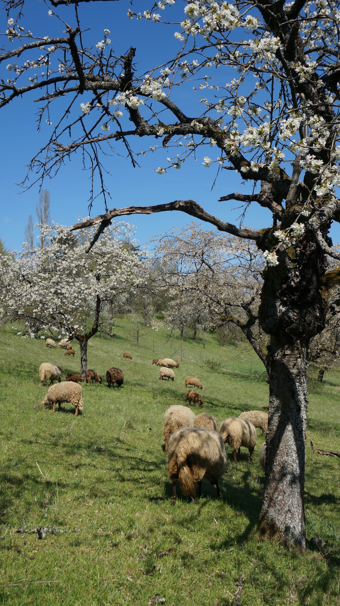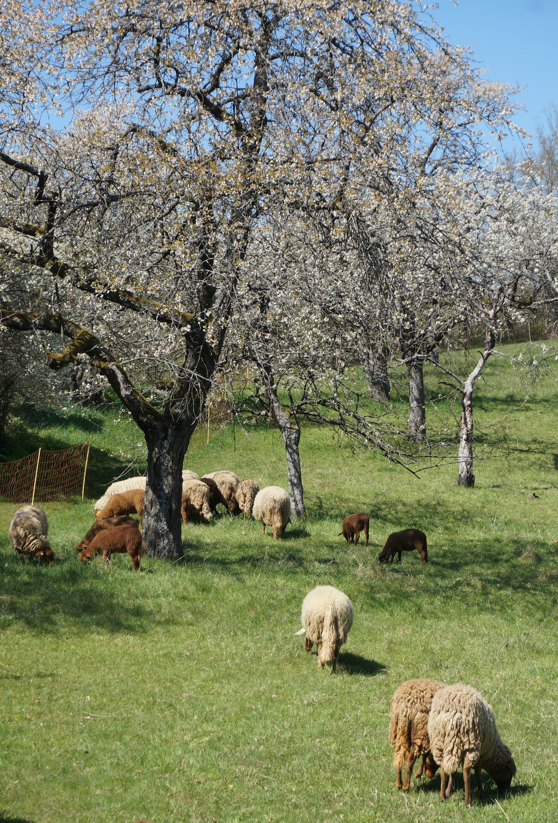 Zum Beispiel auf einer Streuobstwiese in der Nähe von Bamberg. Zwischen weidenden Schafen, Apfelblüten und dem blauen Frühlingshimmel.
