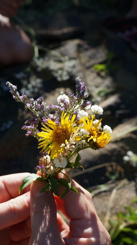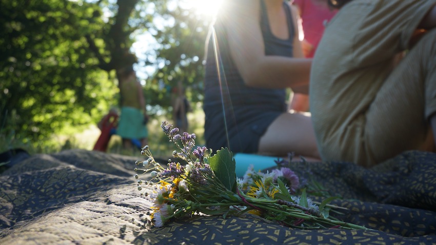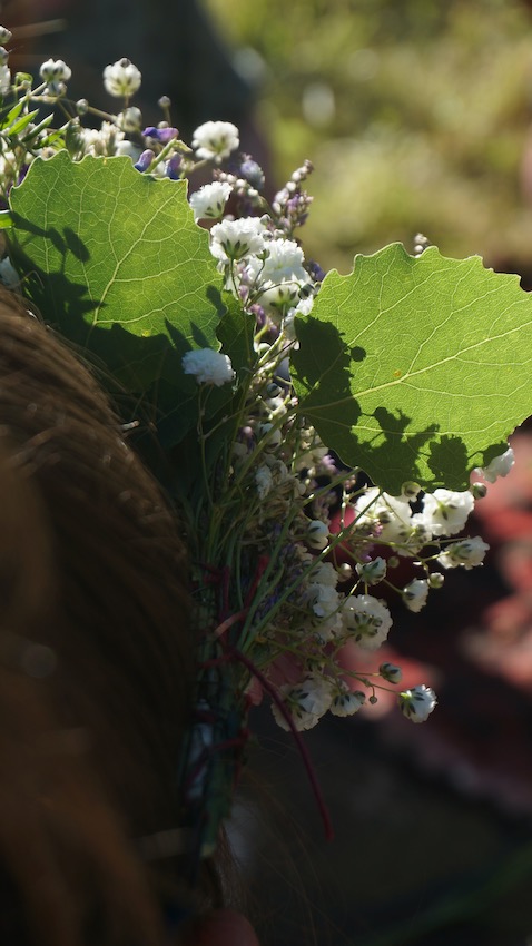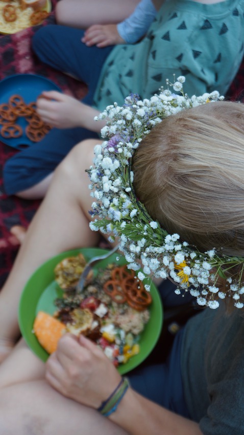 Blumenkränze? Naja, schon sehr hippiemäßig. Nach kurzer verhaltener Reaktion auf unser „Bastel-Set“ saßen dann aber Groß und Klein auf den Decken und banden Mittsommer-Kränze. Erst viele kleine Sträuße, die dann auf einem Draht zu einem Blumenkranz wurden.