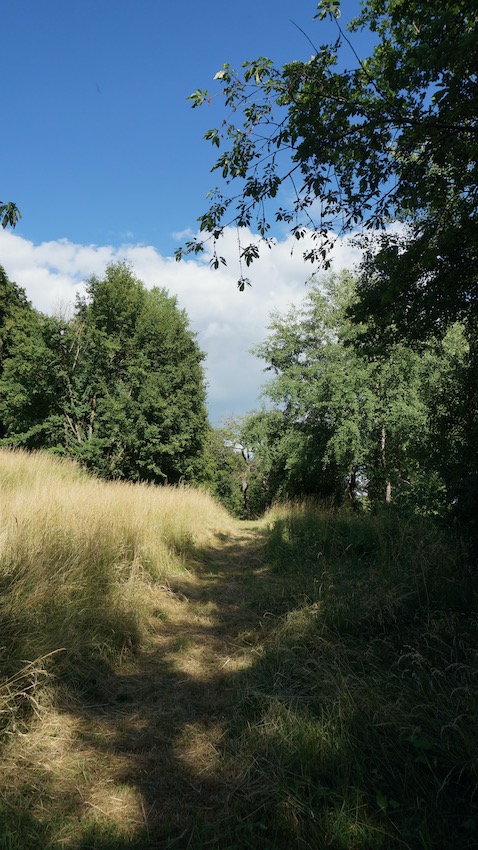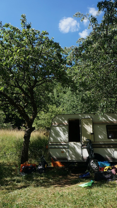 Was soll man viel sagen? Eine Wiese, die ein Freund ein paar Tage zuvor mit der Sense gemäht hatte, ein alter Wohnwagen und Natur in Sommerfarben. Kein Ort hätte für uns schöner sein können.