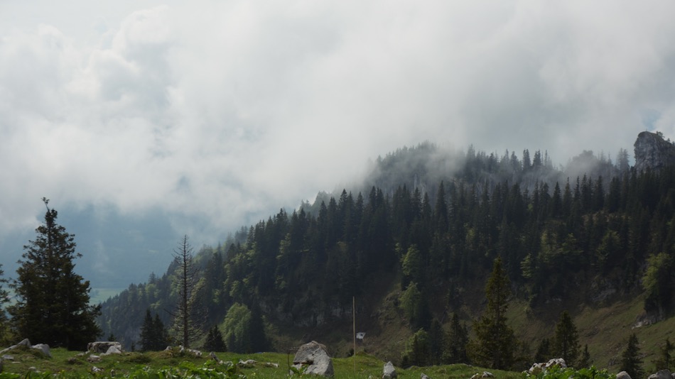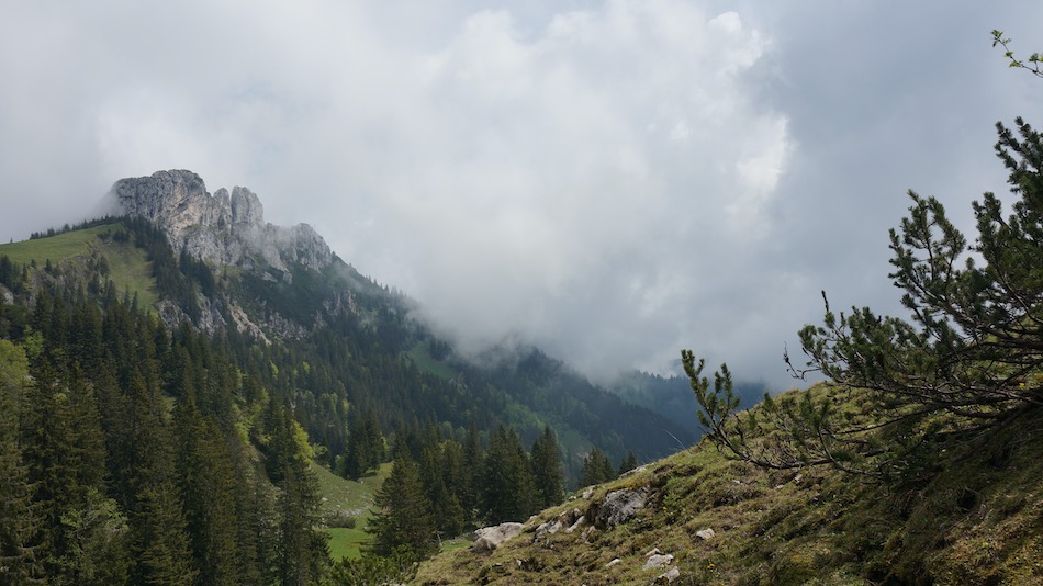 Doch schon auf der Fahrt nach oben waberten dichte Wolken um die Felsen. Der Empfang an der Bergstation war noch sonnencreme-sonnig, aber der geplante Weg in Richtung Kampenwand zog immer mehr zu. Noch dazu wollte unser Kind an diesem Tag lieber getragen werden, statt zu wandern.