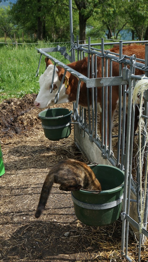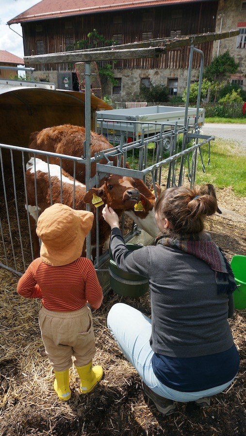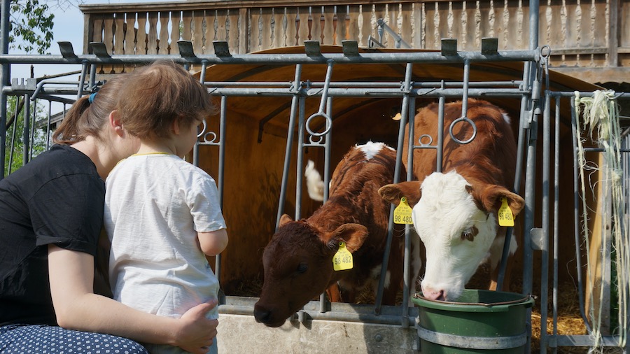 Neben den Katzen, die sofort zur Stelle waren, wenn es irgendwo Milch gab, waren die zwölf Kühe und Kälbchen ein weiteres Highlight am Rieplhof. Von Ella, Enzian und Petra redete unser Kind noch Monate später.