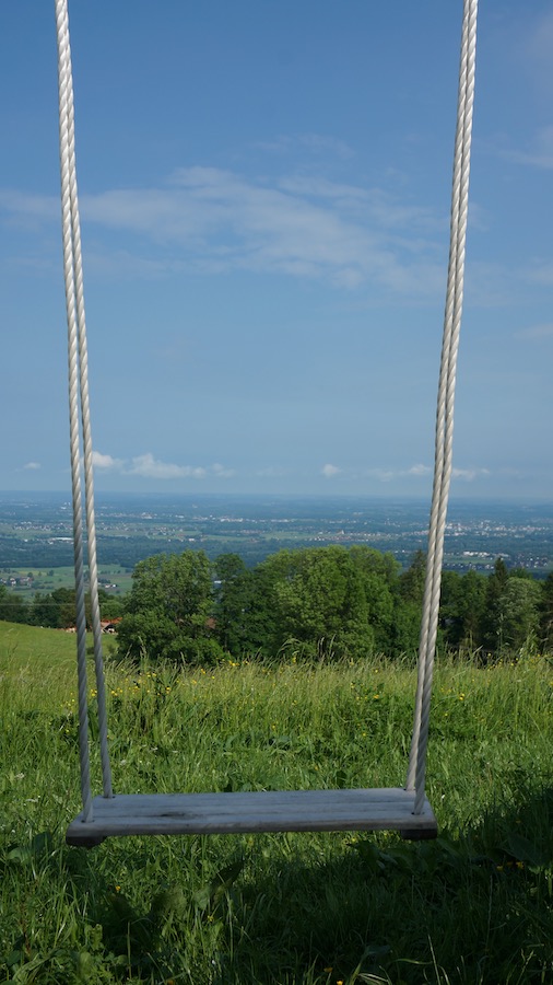 Da ist es fast unnötig Kindern Trettraktor, Schaukel und Rutsche anzubieten. Eigentlich ist ja der ganze Rieplhof ein großer Entdeckungs- und Abenteuer-Spielplatz. Aber Eltern gibt es ja auch noch, die vielleicht mal mit einem solchen Ausblick schaukeln möchten.