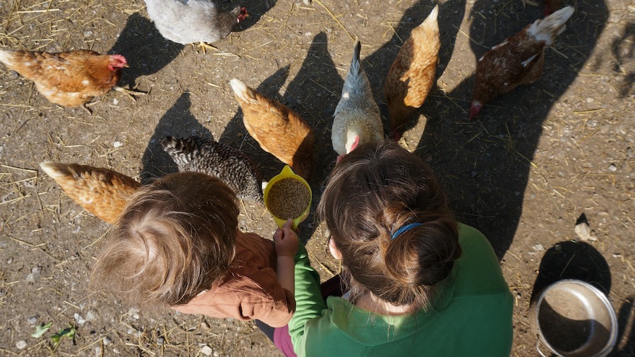 Unser Morgenprogramm war also fest gebucht: Meditation für Erwachsene (Körner werfen, beobachten, werfen, beobachten…) und für unser dreijähriges Kind ein aufregendes Abenteuer. Vor allem, weil ein Huhn nur aus der Hand gefüttert werden wollte.