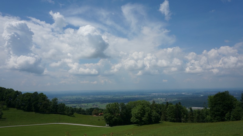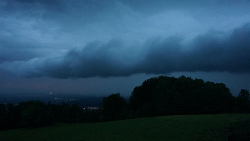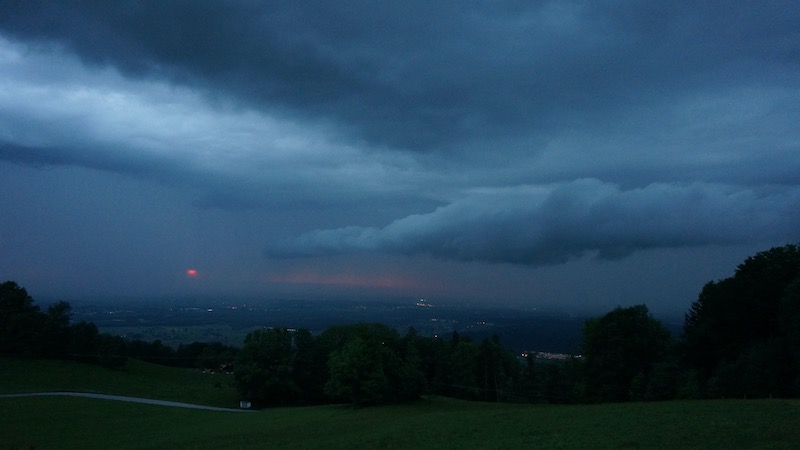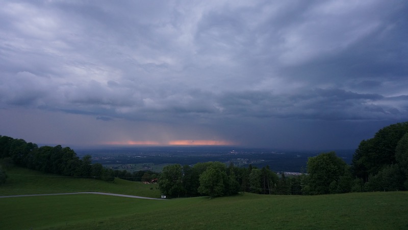 Unser Balkon eröffnete nicht nur einen einzigartigen Blick auf die Kirche St. Peter, den Fuchshof und die weite Ebene um Rosenheim – sondern auch auf die schönsten Wetterphänomene. Zum Beispiel eine Wolkenwalze, die mit all ihrem Blitz und Donner dann auch direkt über unser Dach rollte.