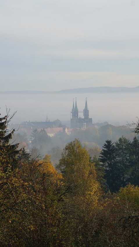 Bis auf die höchsten Kirchturmspitzen ist ganz Bamberg im Nebelmeer versunken.
